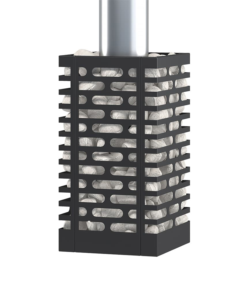 После установки промежуток между каменкой и сеткой заполняют камнями для бани средней фракции.