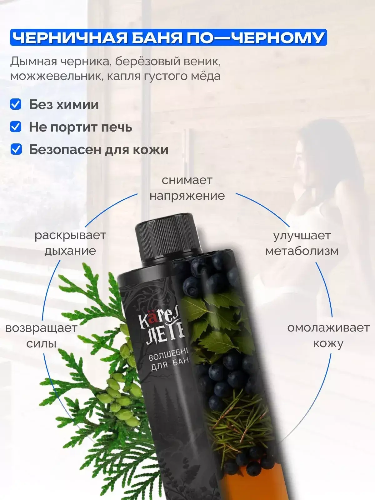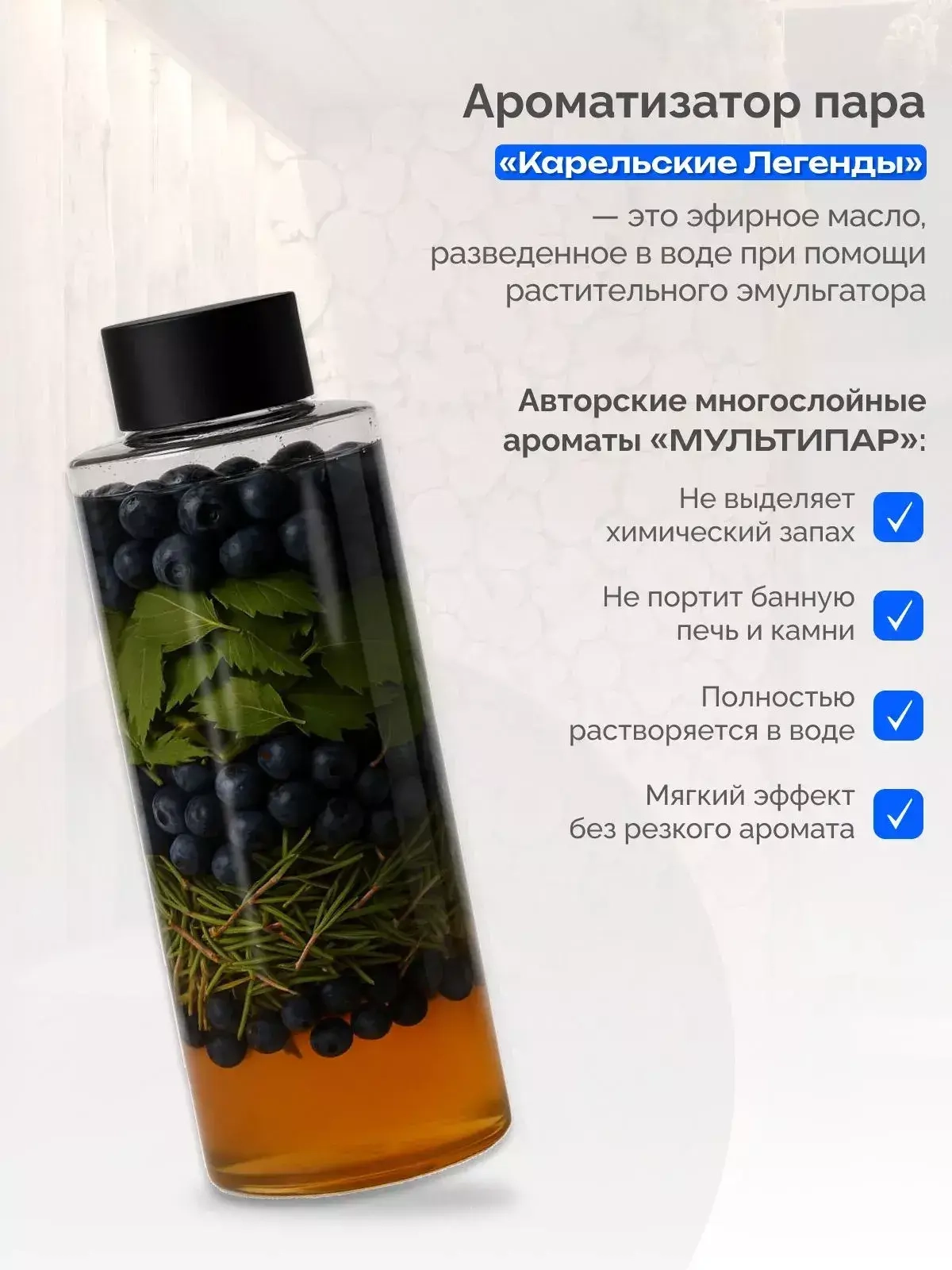 Аромат словно переносит в старую карельскую баню среди темной тайги.