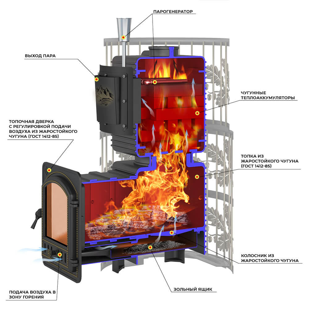 Каменка и внешний корпус изготовлены из чугуна, крепятся друг к другу по типу «паз-гребень» с использованием термостойкого герметика.