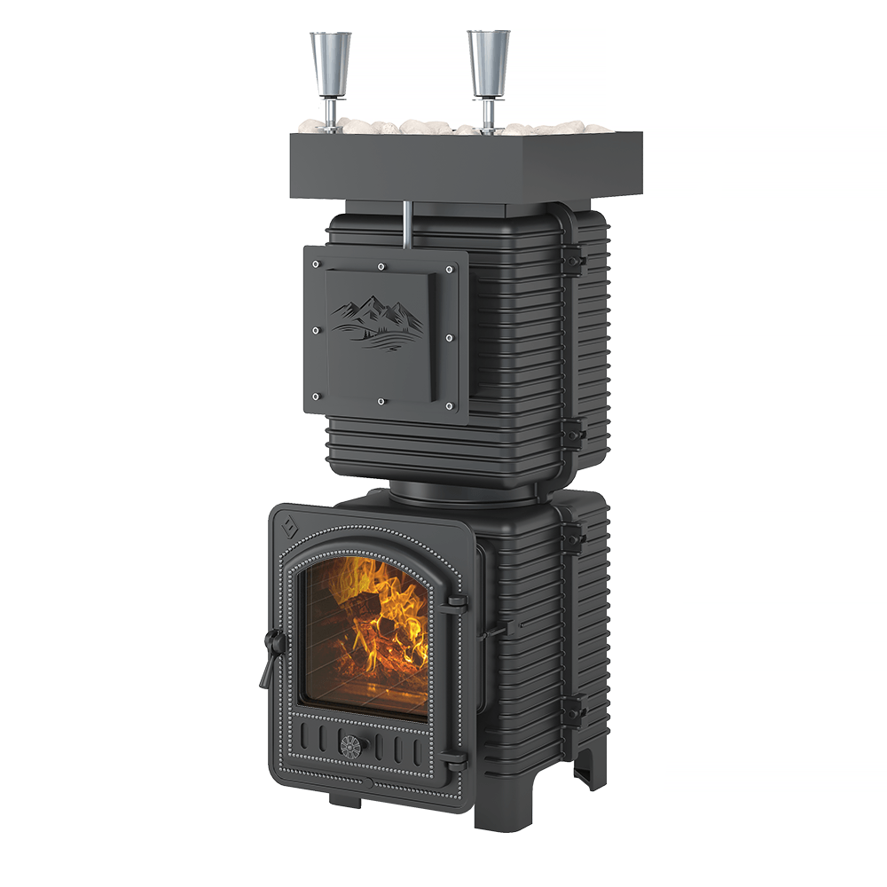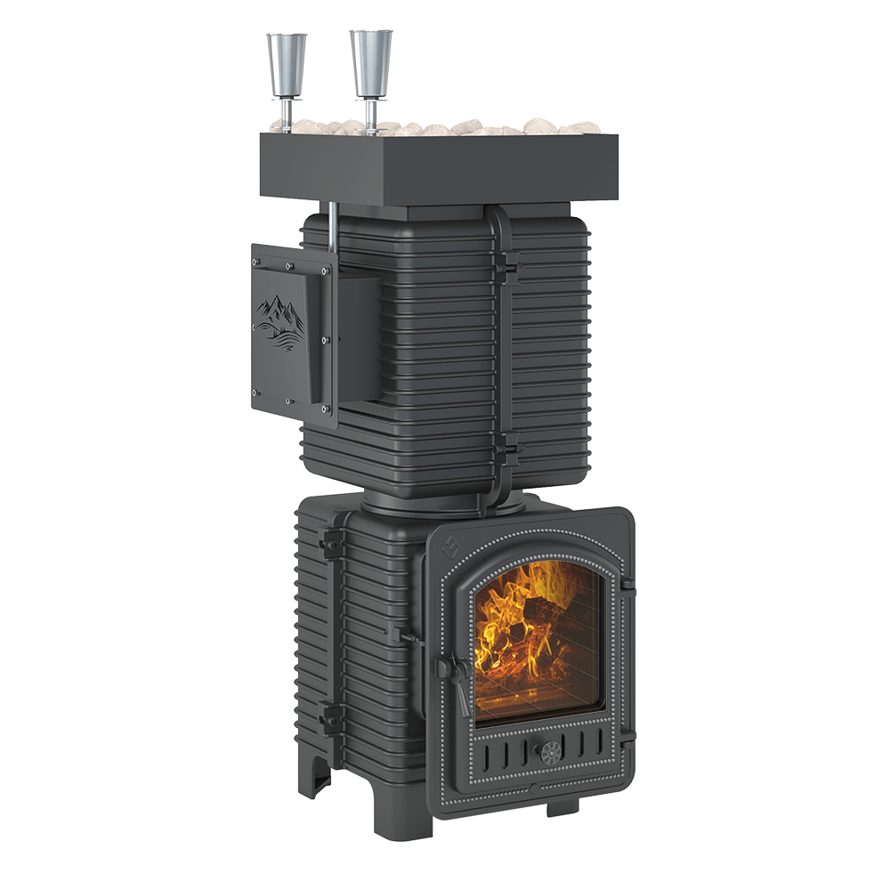 Закрытая каменка рассчитана на размещение 60 килограммов камня для бани, создаёт массивный тепловой заряд.