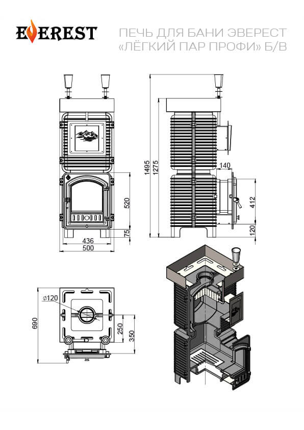 Поворотная чугунная банная печь EVEREST Лёгкий Пар ПРОФИ предназначена для обогрева парных помещений объёмом до 44 кубических метров и получения пара при эксплуатации в частных и коммерческих банях.