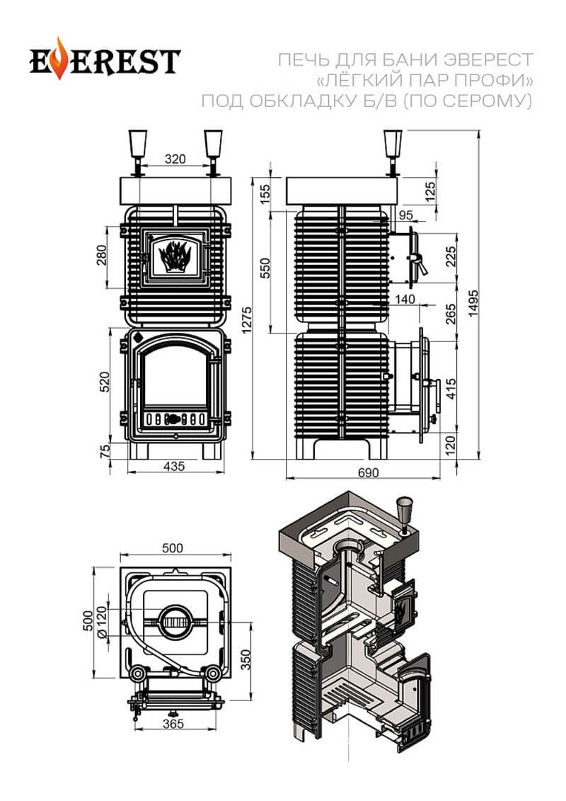 Поворотная чугунная банная печь EVEREST Лёгкий Пар ПРОФИ с каменкой по-серому предназначена для обогрева парных помещений объёмом до 44 кубических метров и получения пара при эксплуатации в частных и коммерческих банях.