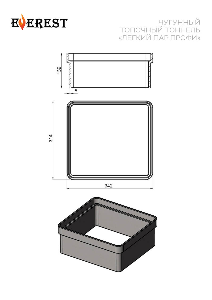 Конструктивно удлинитель повторяет штатный тоннель печи Эверест Лёгкий Пар Профи, изготовлен из жаропрочного чугуна.