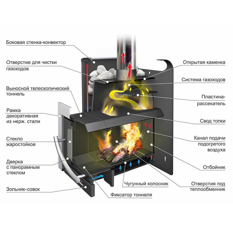 Все наружные стальные элементы корпуса печи, топочный канал, каменка и кожух окрашены качественной жаропрочной износостойкой кремнийорганической краской черного матового цвета.
