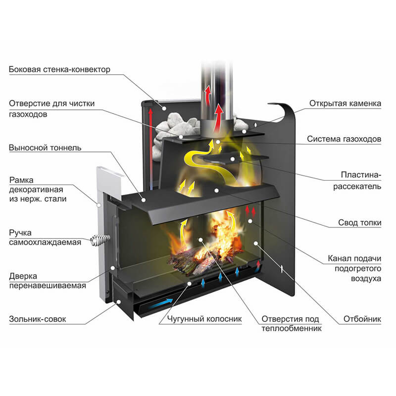 В конструкции дымовых каналов предусмотрено прочистное отверстие для удобного обслуживания печи.