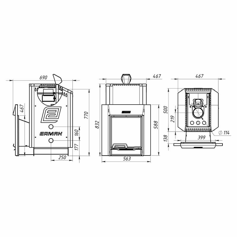 В боковых стенках кожуха также предусмотрены 2 отверстия для установки теплообменника.