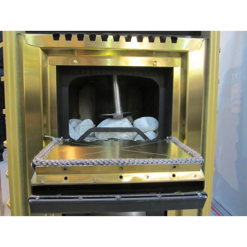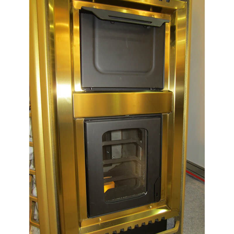 Элементы декора, задняя стенка, обрамление печи, дверцы и зольника выполнены из пищевой жаропрочной нержавеющей стали INOX AISI-304 золотого цвета.