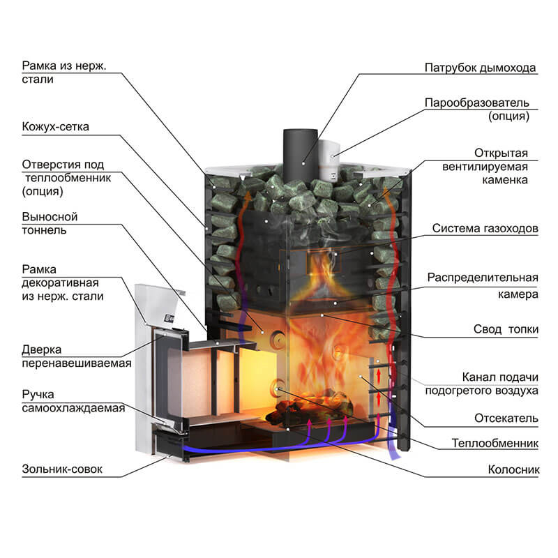Печь передает максимум тепловой энергии от сжигания дров на камни, тем самым сильно снижая температуру дымовых газов на выходе в дымоход, что благоприятно скажется на длительности его службы.
