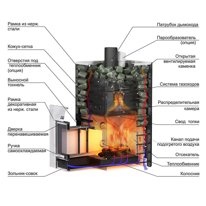 Деление огня из топки на 4 потока и сложная конструкция дымовых каналов с распределительной камерой позволили увеличить КПД печи и сделать нагрев камней в каменке более сильным.