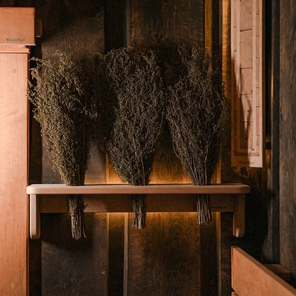 Фито-полка с подсветкой создаёт мягкое освещение и позволяет организовать пространство в бане и сауне, навести порядок и превратить стандартный банный аксессуар - веник - в элемент оригинального декора.