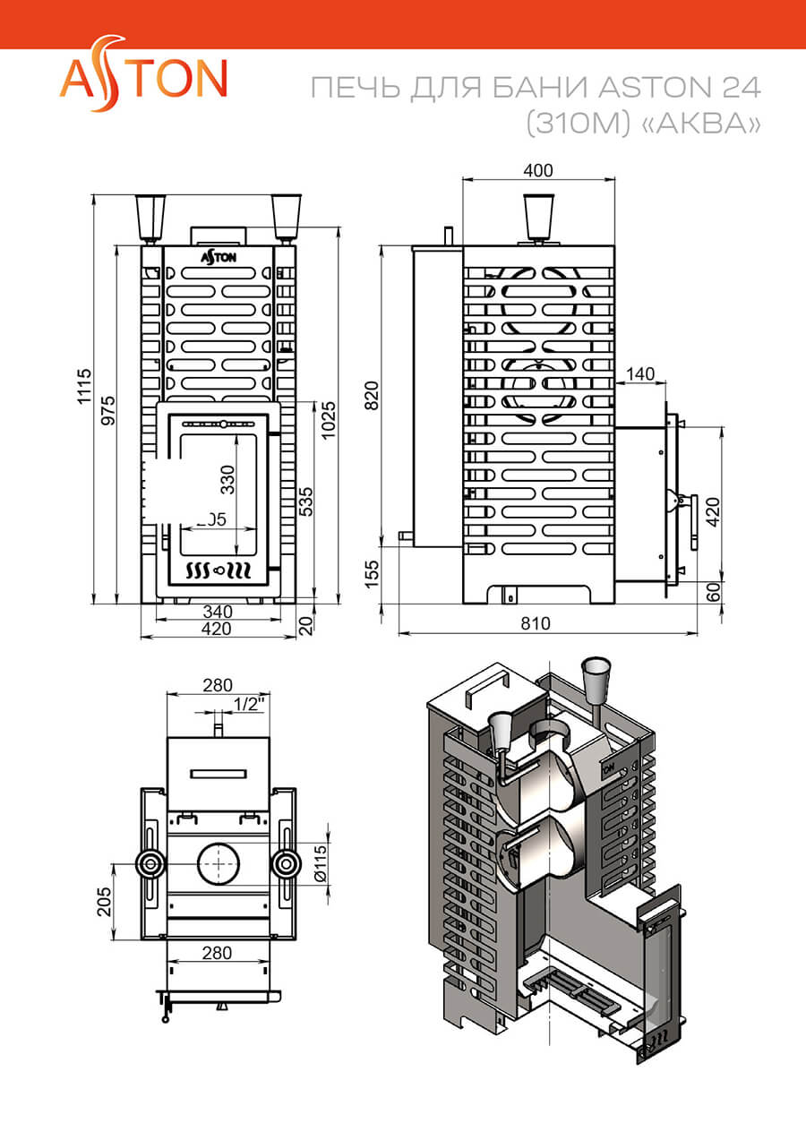 Печь ASTON из нержавеющий стали марки AISI 430 толщиной 4мм устойчива к окислению и прогару.