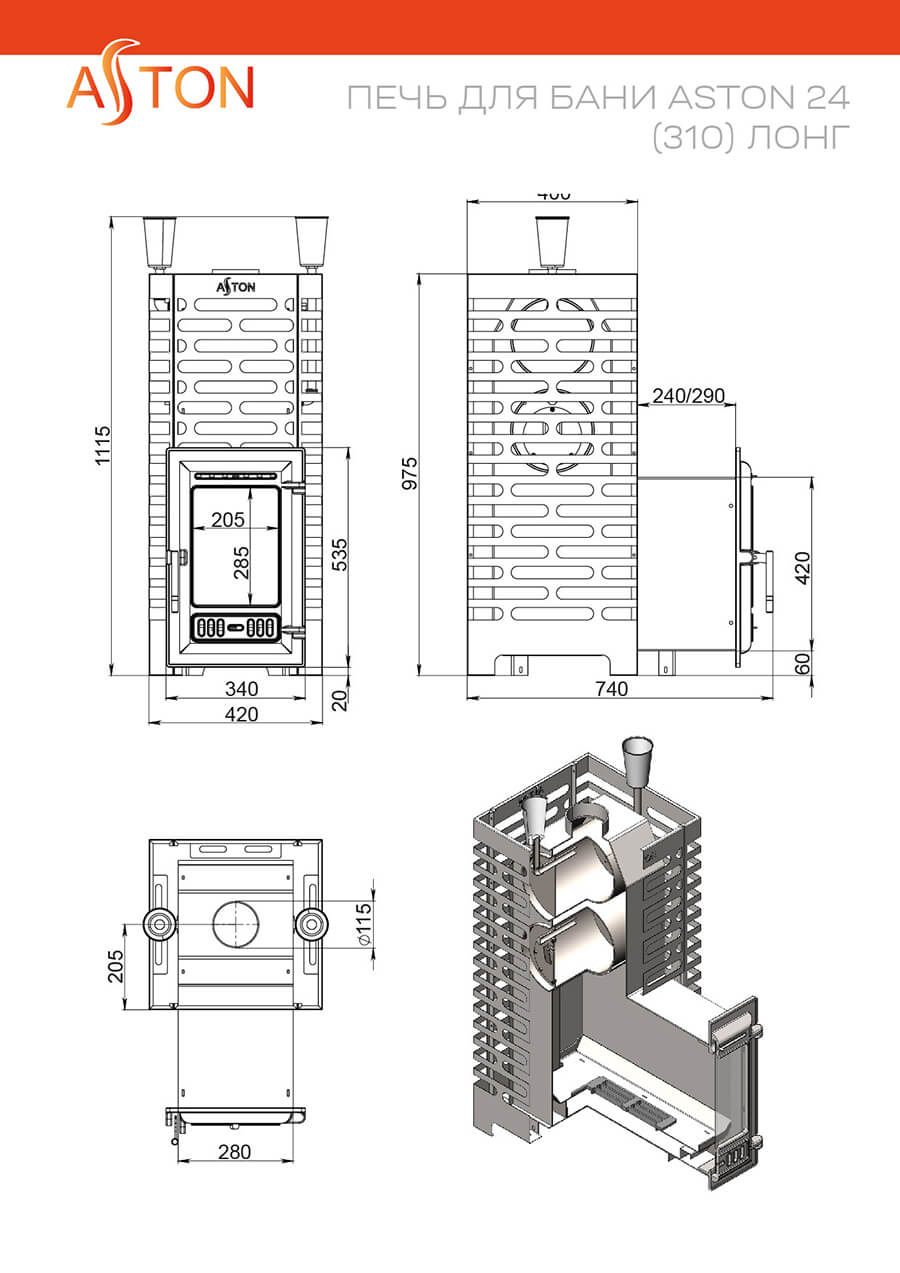 Печь для бани ASTON 24 INOX Long (310) Нержавеющая сталь.