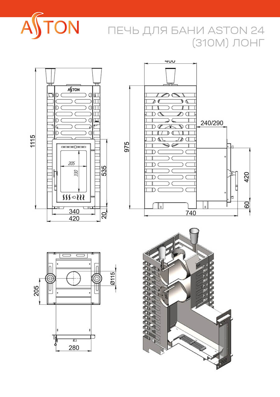 Печь для бани ASTON 24 INOX Long (310М) Нержавеющая сталь.