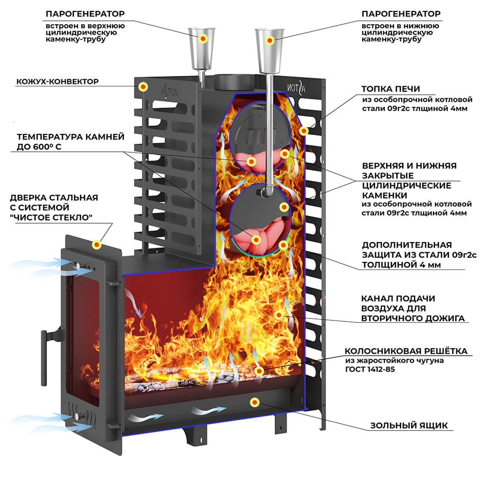 ASTON — бренд банных печей для бюджетных парных и бань-бочек. Несмотря на доступную цену, их конструкция очень интересна: