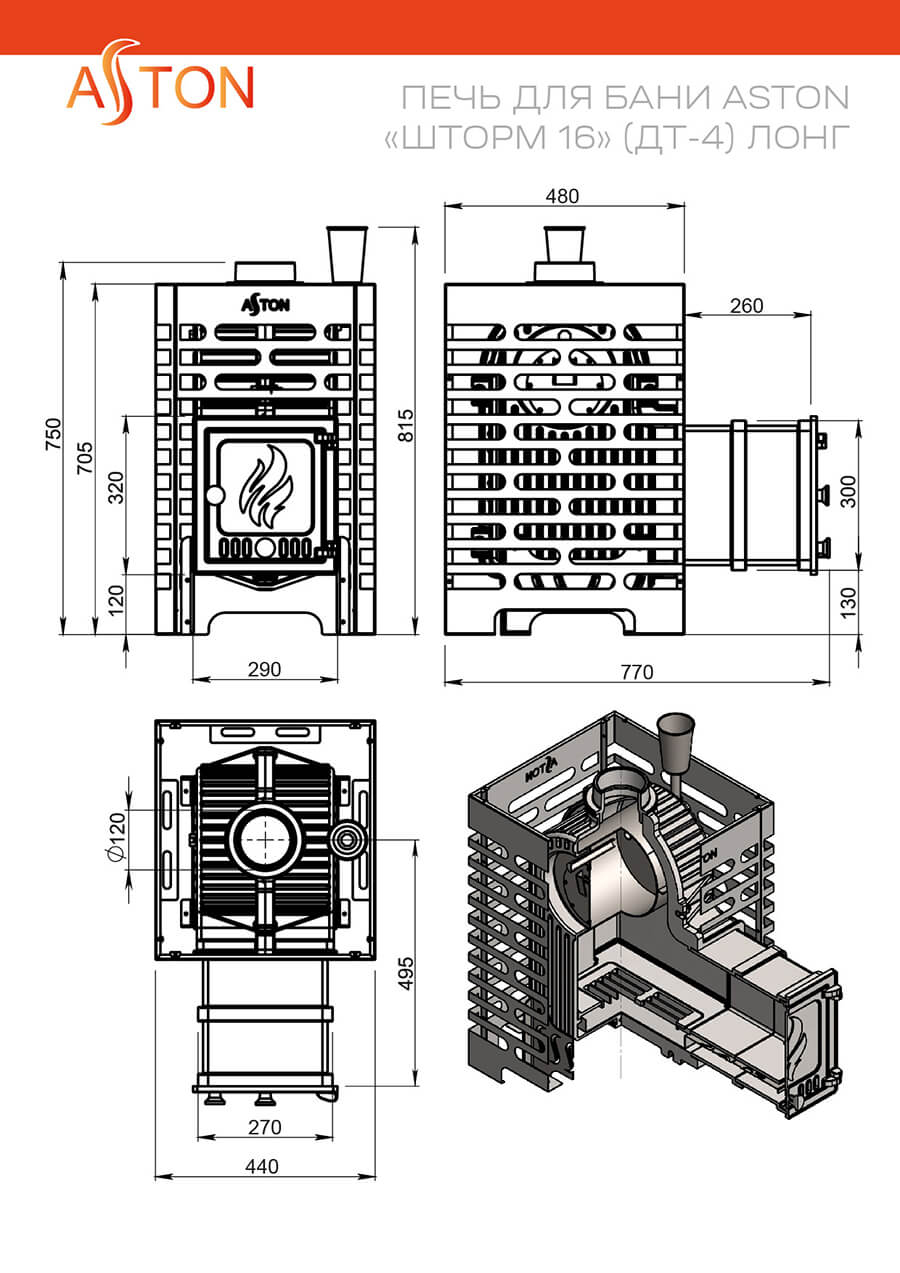 Печь для бани ASTON "Шторм 16" Long (ДТ-4) Чугун.