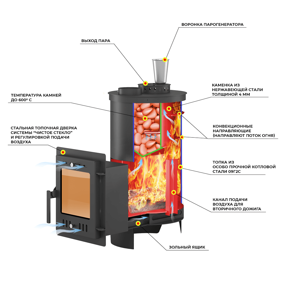 Каменка оригинальной формы исключает накопление сажи в дымоходе и исполняющая функцию пламя гасителя так как размещена прямо на пути пламени и дымовых газов что позволяет нагреть камни до температур свыше 600 ºС.