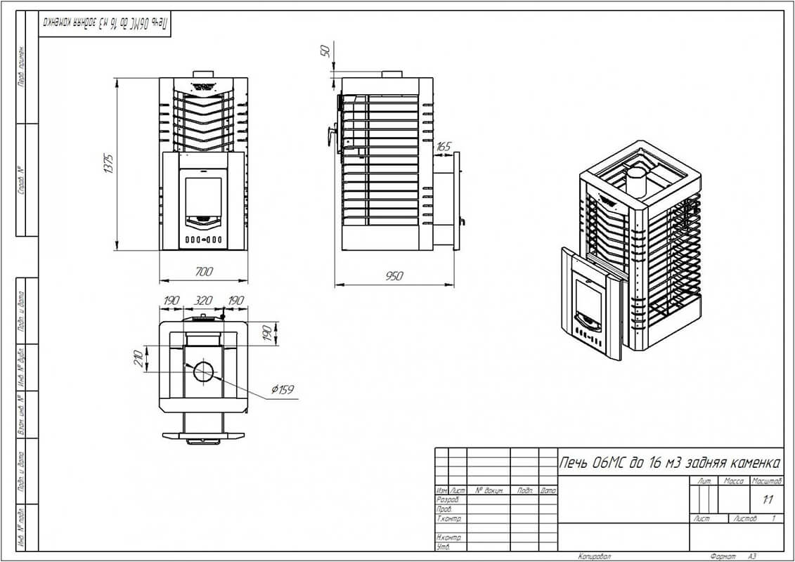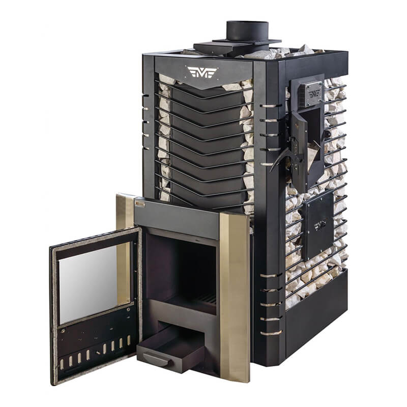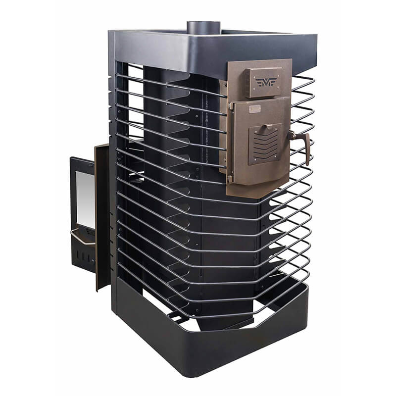 Объемную не вентилируемую каменку с массой загрузки в бытовых моделях до 200кг и в коммерческих до 350кг.
