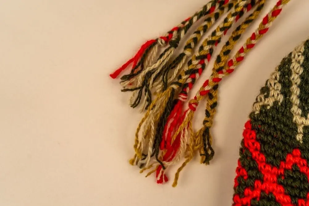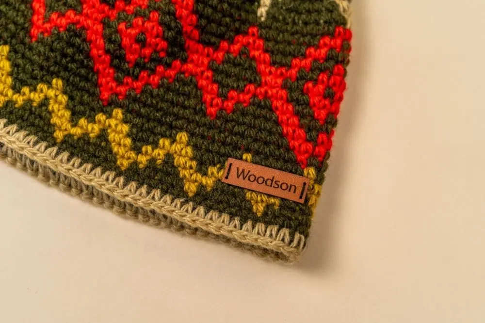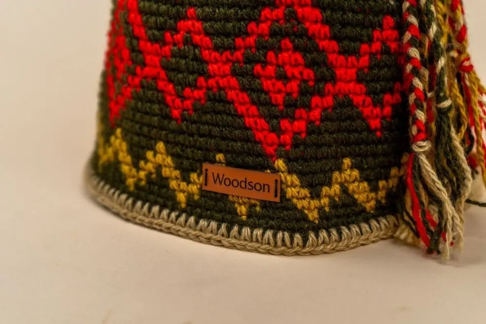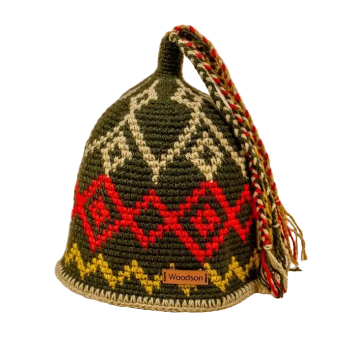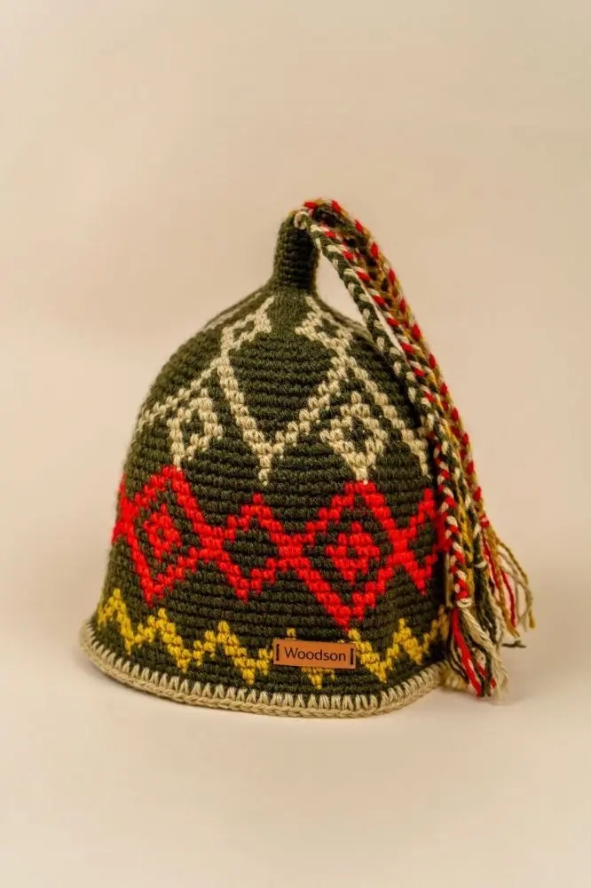 Шапка ручной работы с орнаментом в оттенке хаки.
