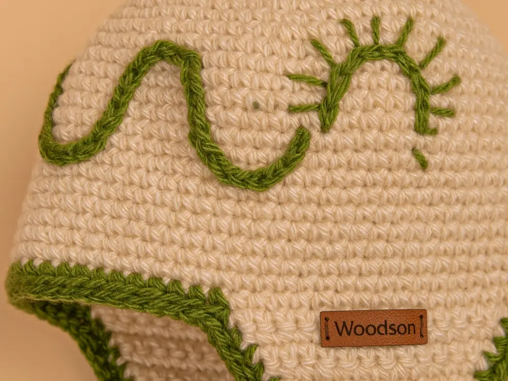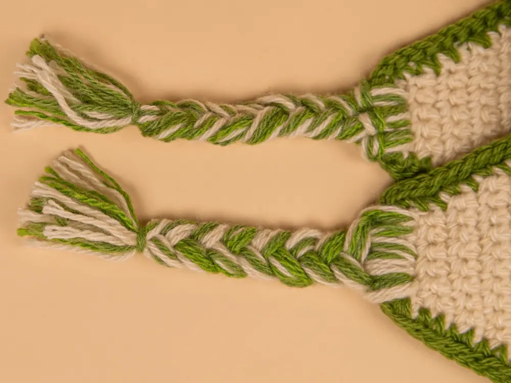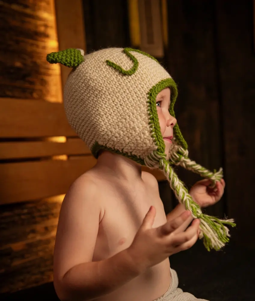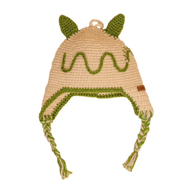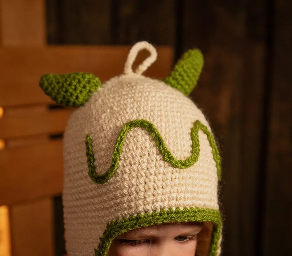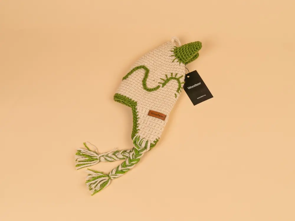 Шапка детская с двумя косичками имеет оригинальный рисунок в молочном и зелёном оттенке.