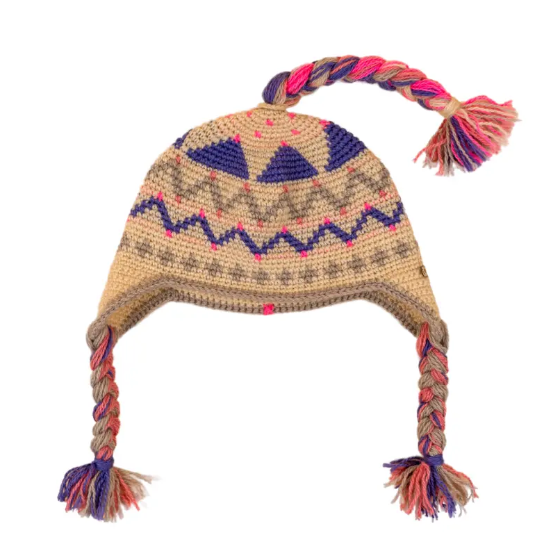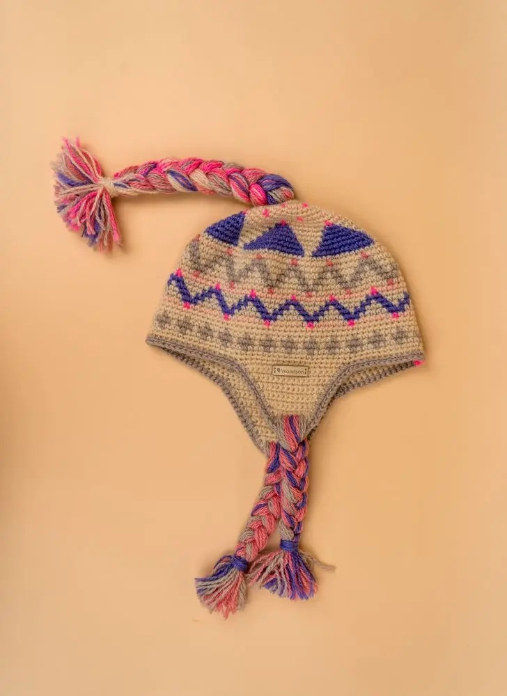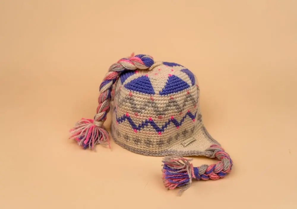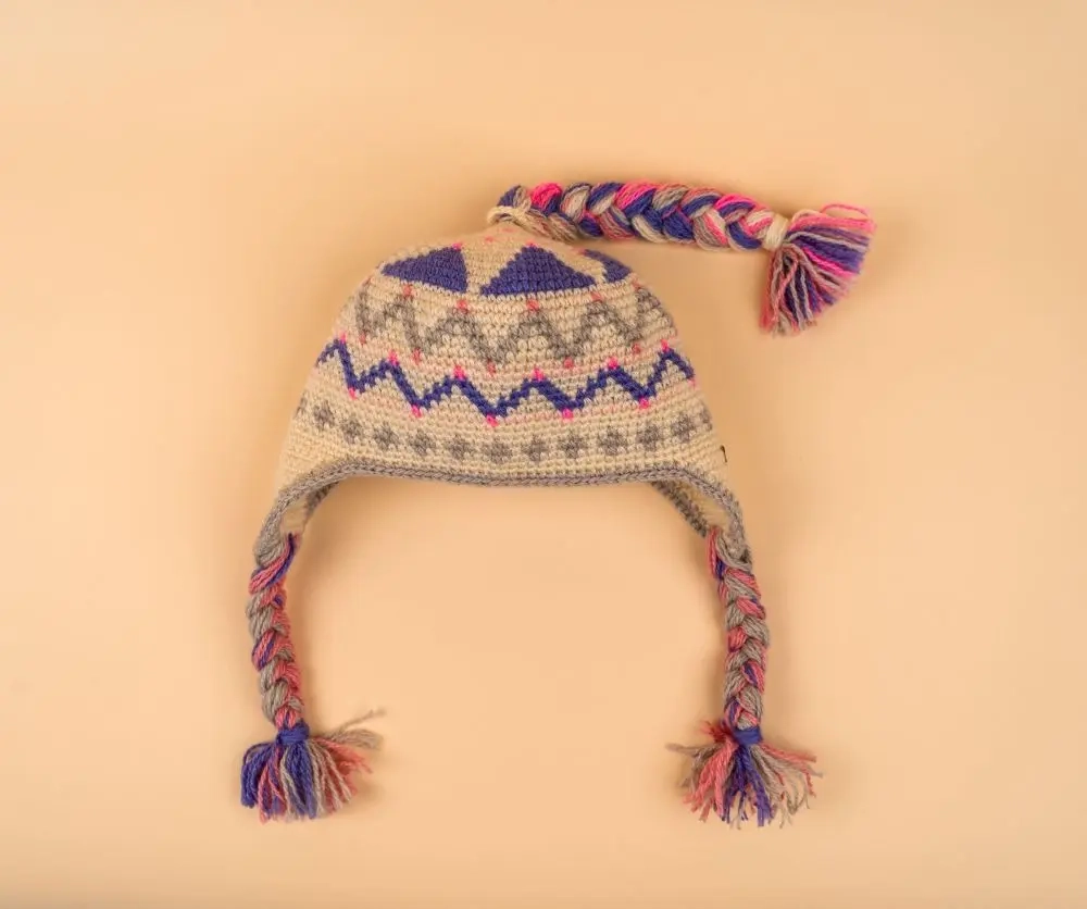 Шапка ручной работы с орнаментом в оттенке: молочный. фиолетовый, розовый, серый.